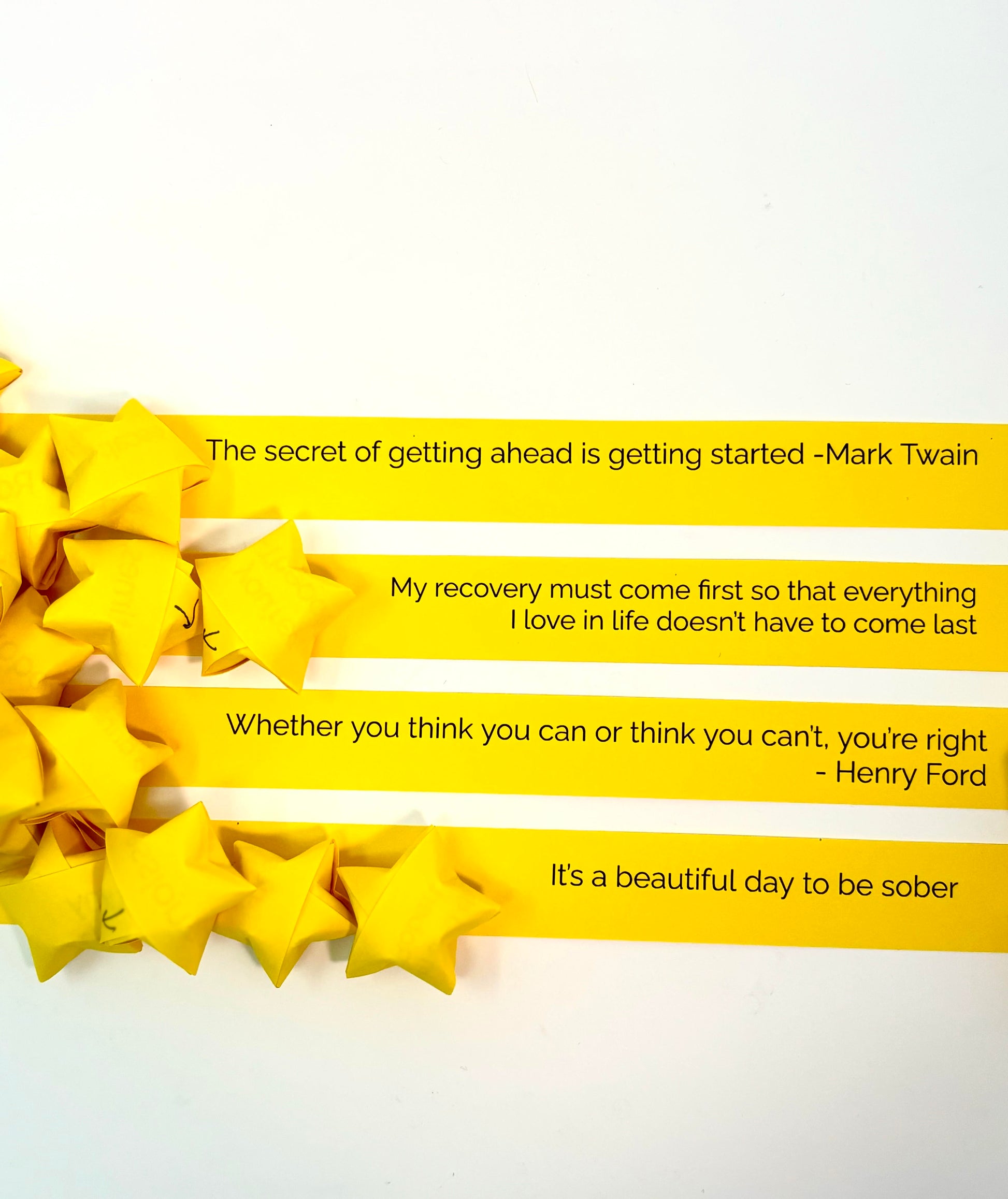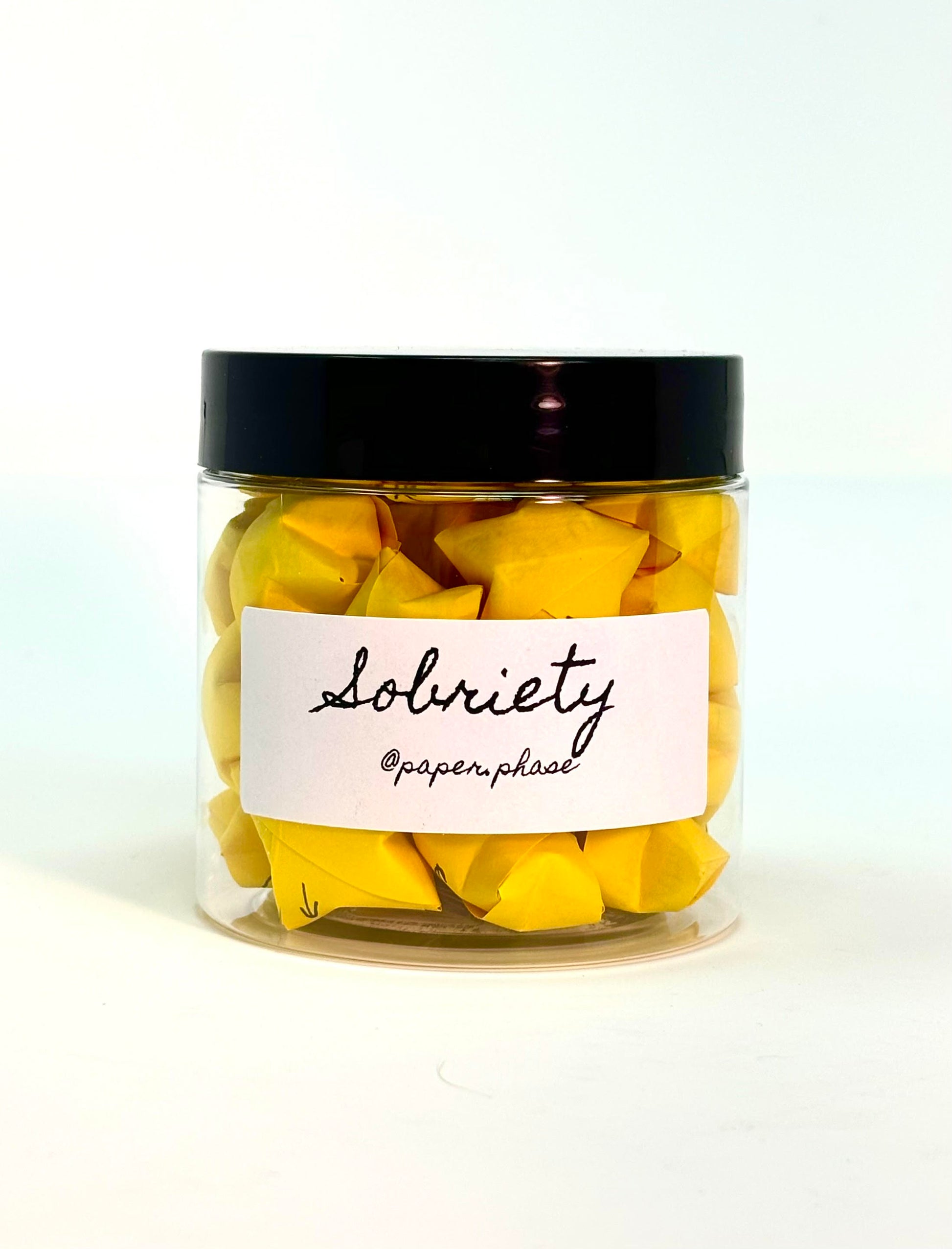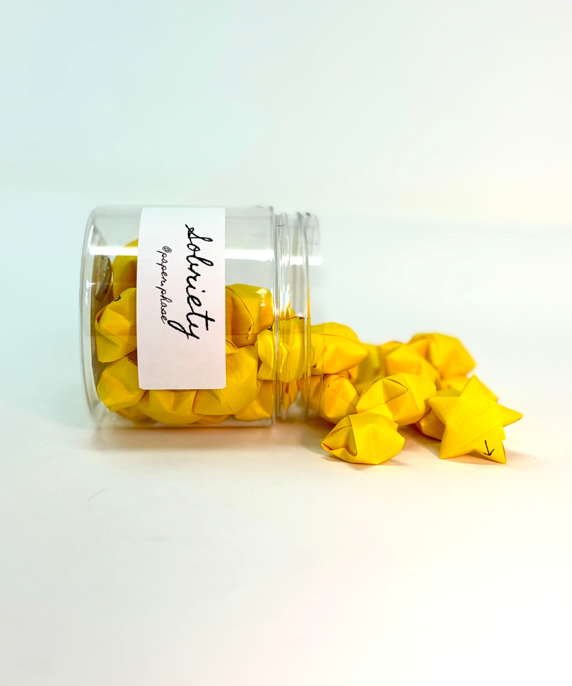 Sobriety Jar - 6oz jar / Contains at least 31 stars. Each star is a quote about sobriety. Open one to reveal a sobriety quote full of self love, motivation, inspiration and recovery confidence to keep you moving forward and being your bada** self! Having a rough day? Week? Open one of these lucky stars to give you a boost!